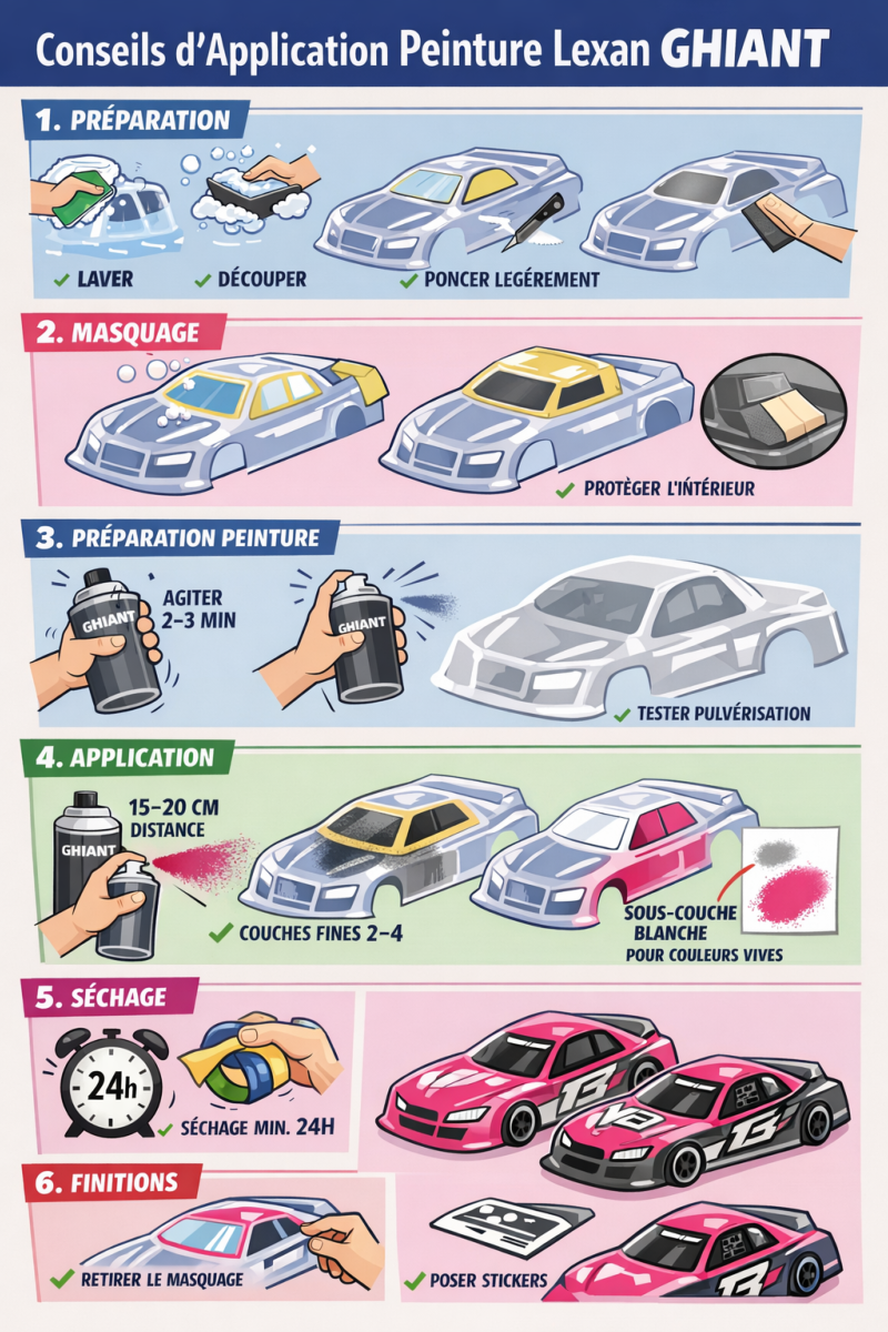 Voici un guide pratique et détaillé pour appliquer une peinture Lexan de la marque GHIANT, FASTRAX sur vos carrosseries RC, tout en obtenant un résultat professionnel et durable :
